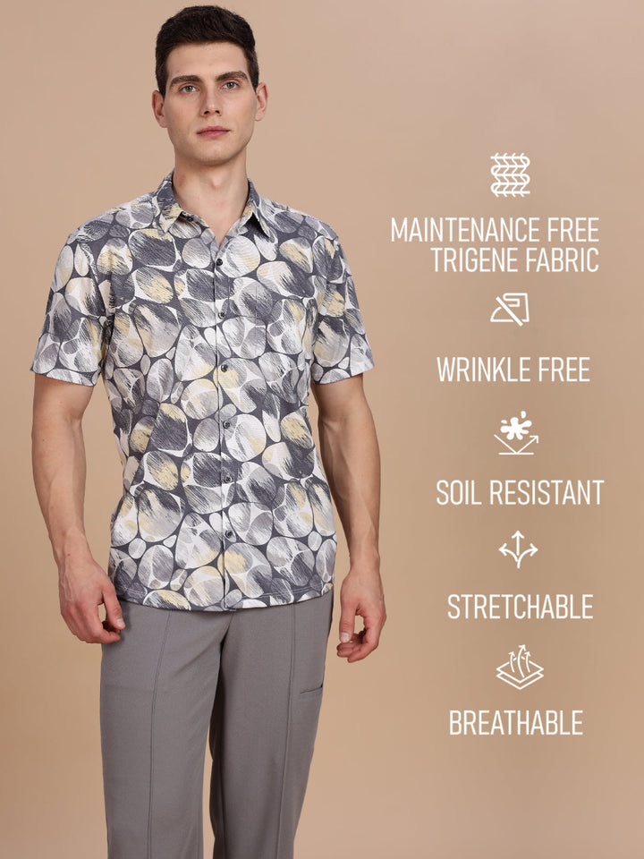 WEXFORD Trendy Grey Printed Regular Fit Cotton Blend Half sleeve Casual Shirt For Men. Upgrade your wardrobe with the WEXFORD Trendy Printed Regular Fit Cotton Blend Half Sleeve Casual Shirt for Men. Designed for style and comfort, this shirt features a premium cotton blend fabric that ensures breathability and durability and Chest Logo With Pocket. Its trendy printed design adds a touch of modern fashion, making it perfect for casual outings, office wear, or weekend gatherings. The regular fit provides a relaxed yet structured look, while the half sleeves keep you cool and comfortable throughout the day. Pair it with jeans, chinos, or shorts for a versatile and stylish ensemble. Easy to maintain and machine washable, this shirt is a must-have addition to your collection.